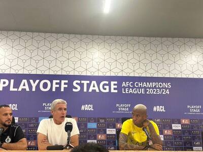 تاليسكا لاعب #النصر في المؤتمر الصحافي: - خلقنا العديد من الفرص.. وهناك كثير من الفرص مفترض "ركلة جزاء".. - كاسترو يقاطعه ضاحكاً: كان بامكانك تسجيلها من خارج المنطقة.