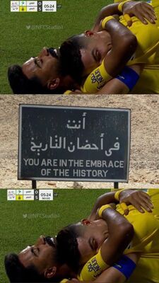 ويظهر في مقطع الفيديو المتداول توجه رونالدو إلى بوشل عقب الهدف الخامس انادي النصر وحضنه.
