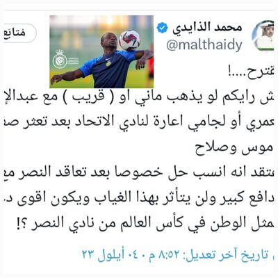 واعتبر الذايدي عبر حسابه الرسمي بمنصة "إكس"، أن نقل ماني وواحد من ثنائي النصر الدفاعي عبد الإله العمري أو علي لاجامي، إلى نادي الاتحاد، أصبح ضرورة قسوة؛ بعد تعثر العميد، في التعاقد مع النجم المصري الكبير محمد صلاح، بالإضافة إلى فشله في ضم قلب دفاع عالمي.